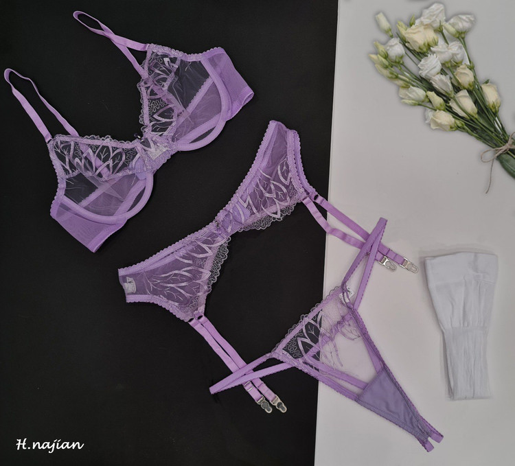ست فانتزی ۴تکه شامل سوتین فنردار، بند جوراب، شورت و جوراب